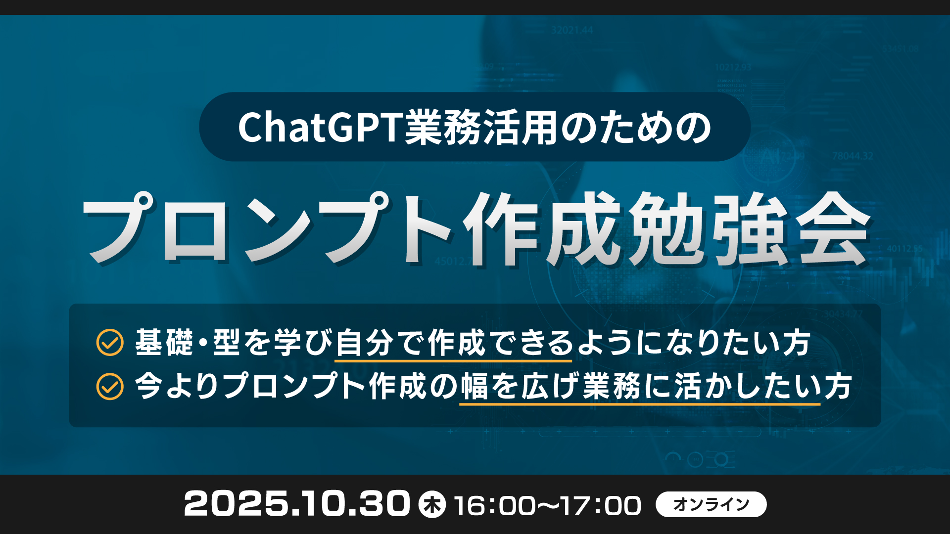 さらに、参加者には業務改善が加速する【プロンプトテーマ50選】をプレゼントします。本勉強会を起点にChatGPTのビジネス活用を加速させ、事業成長・業務改革を推進していっていただけることを目的にしています。