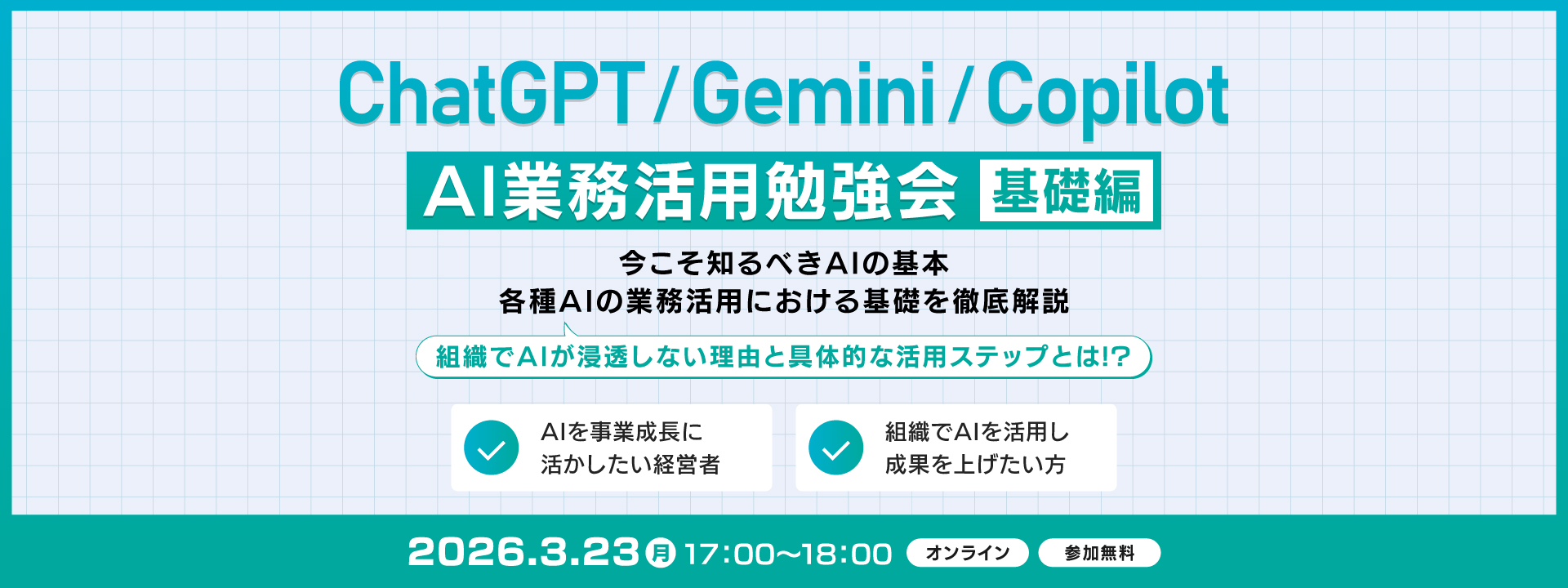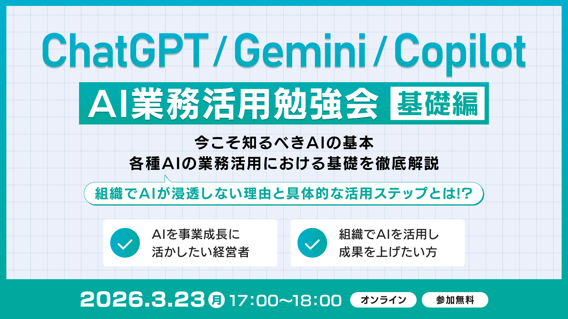 ・個人事業主やフリーランスの方のご参加もお断りしております。(本勉強会はAIの組織活用が主眼のため主旨と異なります)