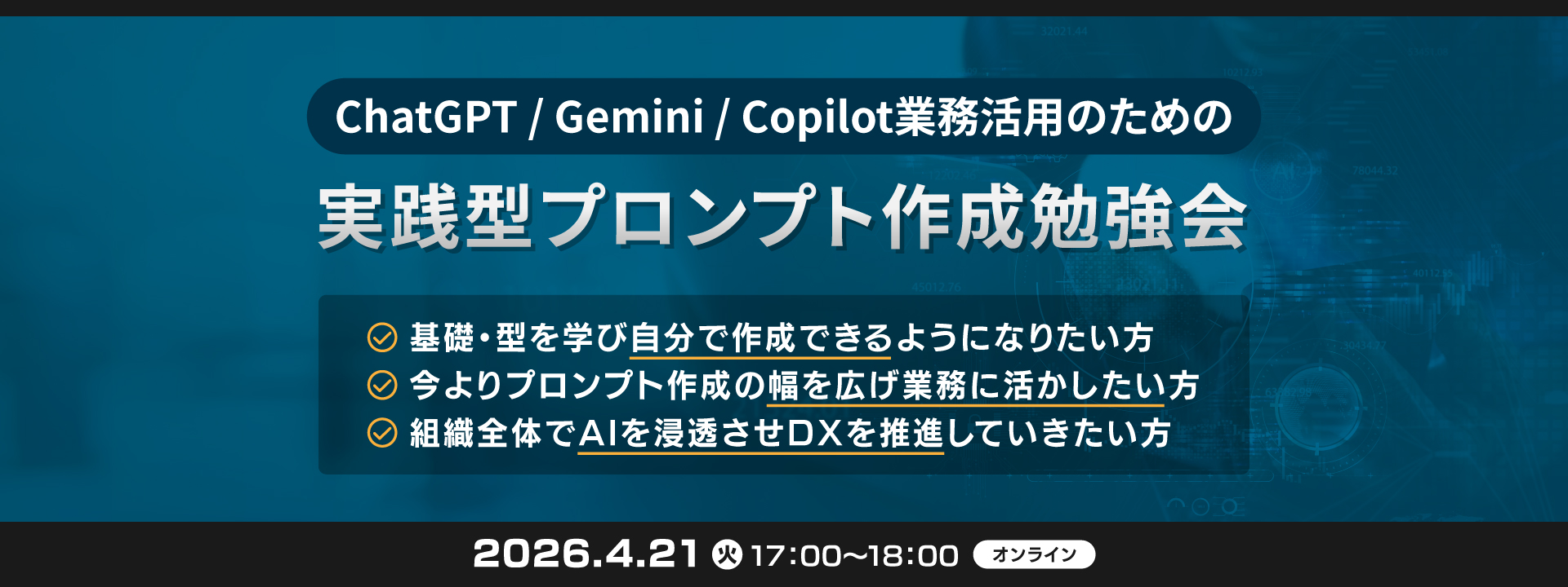 AIの業務活用および組織浸透を加速させるためのプロンプト作成術が学べます。